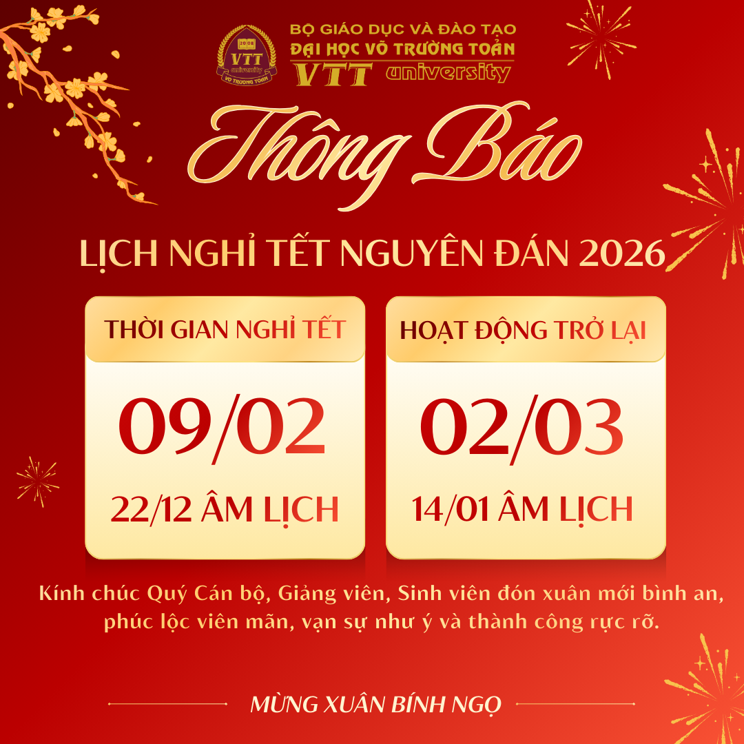 THƯ VIỆN Trường Đại học Võ Trường Toản thông báo thời gian nghỉ Tết Âm lịch năm 2026 như sau: